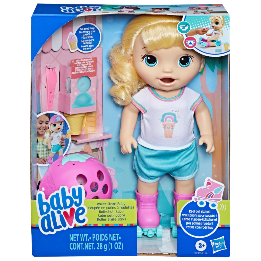 A Boneca Baby Alive com Patins Roller Loira da Hasbro (modelo F5354) oferece diversão ativa para crianças a partir de 3 anos. Com cerca de 30 cm de altura e patins com luzes que acendem ao andar, ela convida a brincar, desenvolver coordenação motora e estimular a imaginação enquanto desliza com estilo.