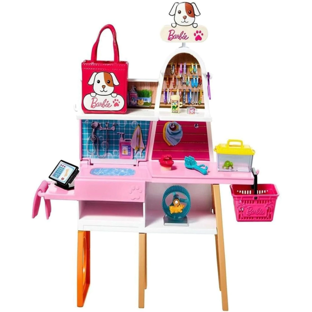 O Playset Barbie Pet Shop Mattel GRG90 reúne diversão, cuidado e criatividade em um só cenário! Inclui boneca Barbie, quatro pets (cachorrinho, gatinho, hamster e tartaruga) e um pet shop com estação de banho que revela manchas de “lama” em água fria e limpa com água morna usando esponja, além de balcão de pagamentos, prateleiras e mais de 20 acessórios para atender, adotar e cuidar dos pets — ideal para estimular empatia, coordenação motora e imaginação desde os 3 anos.