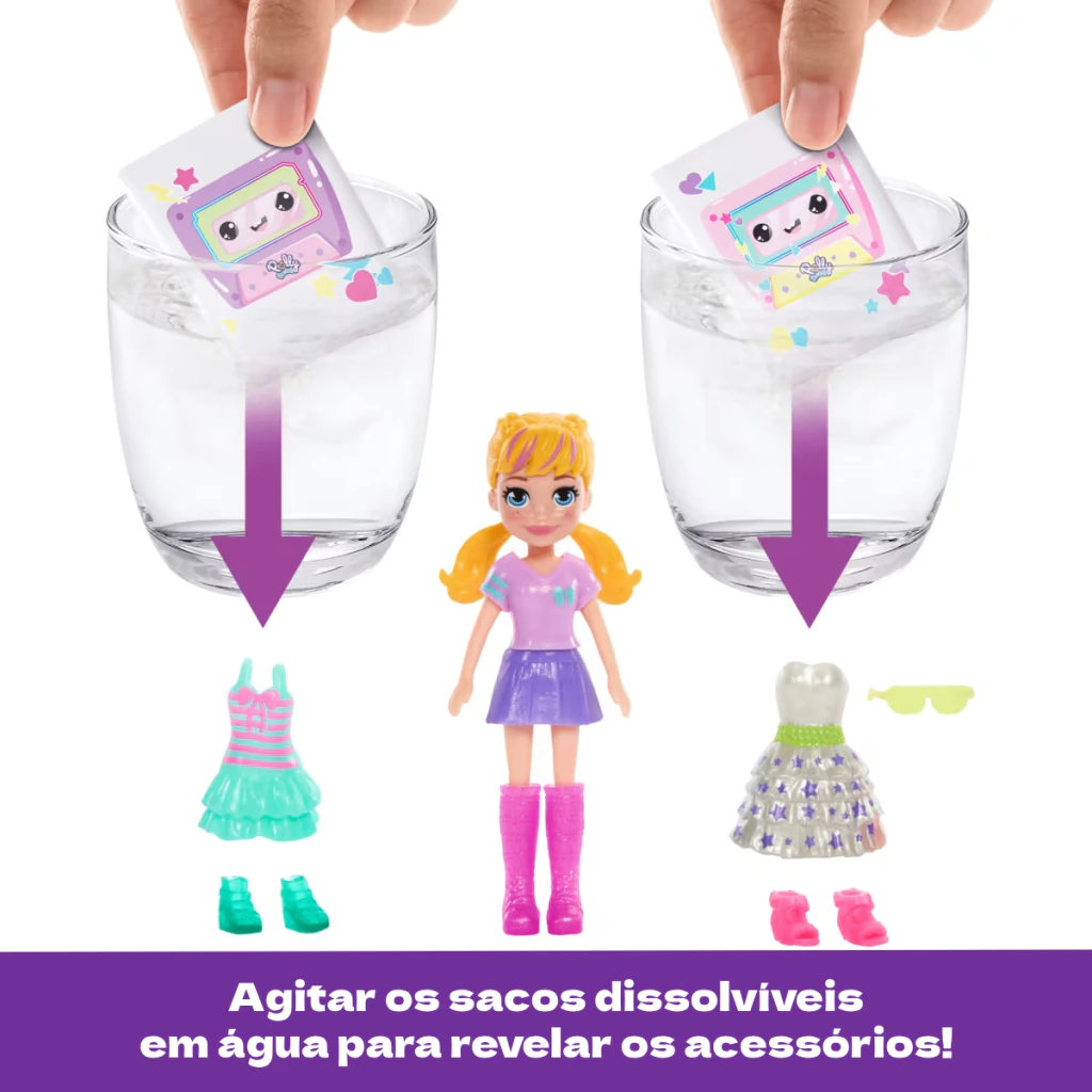 O Polly Pocket Fashion Reveal Baile Discoteca é perfeito para brincar de festa, explorar surpresas em água e inventar histórias coloridas em qualquer lugar.