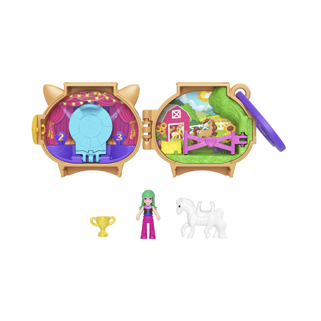 A Boneca Polly Pocket Micro Mundo dos Animais Pônei Mattel JCB20|HMX20 leva a diversão para o universo dos cavalos com um playset portátil em formato de pônei. Ao abrir, revela um estábulo encantador com atividades temáticas, acessórios e duas mini bonecas para criar histórias em qualquer lugar. Compacto e cheio de detalhes, é ideal para levar na mochila e brincar onde quiser.