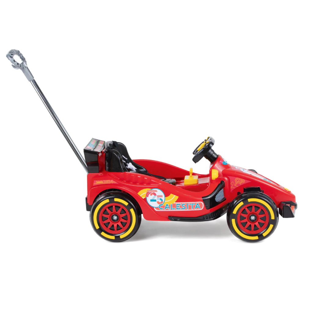 O Carrinho de Empurrar F25 Vermelho Calesita 1080 é um brinquedo 2 em 1 que pode ser utilizado como carrinho de passeio com empurrador e aro protetor, e como carrinho a pedal ao remover os acessórios. Com design inspirado em carros de corrida, possui volante com buzina sonora, rodas emborrachadas para maior aderência e adesivos exclusivos, proporcionando diversão e desenvolvimento para os pequenos pilotos.