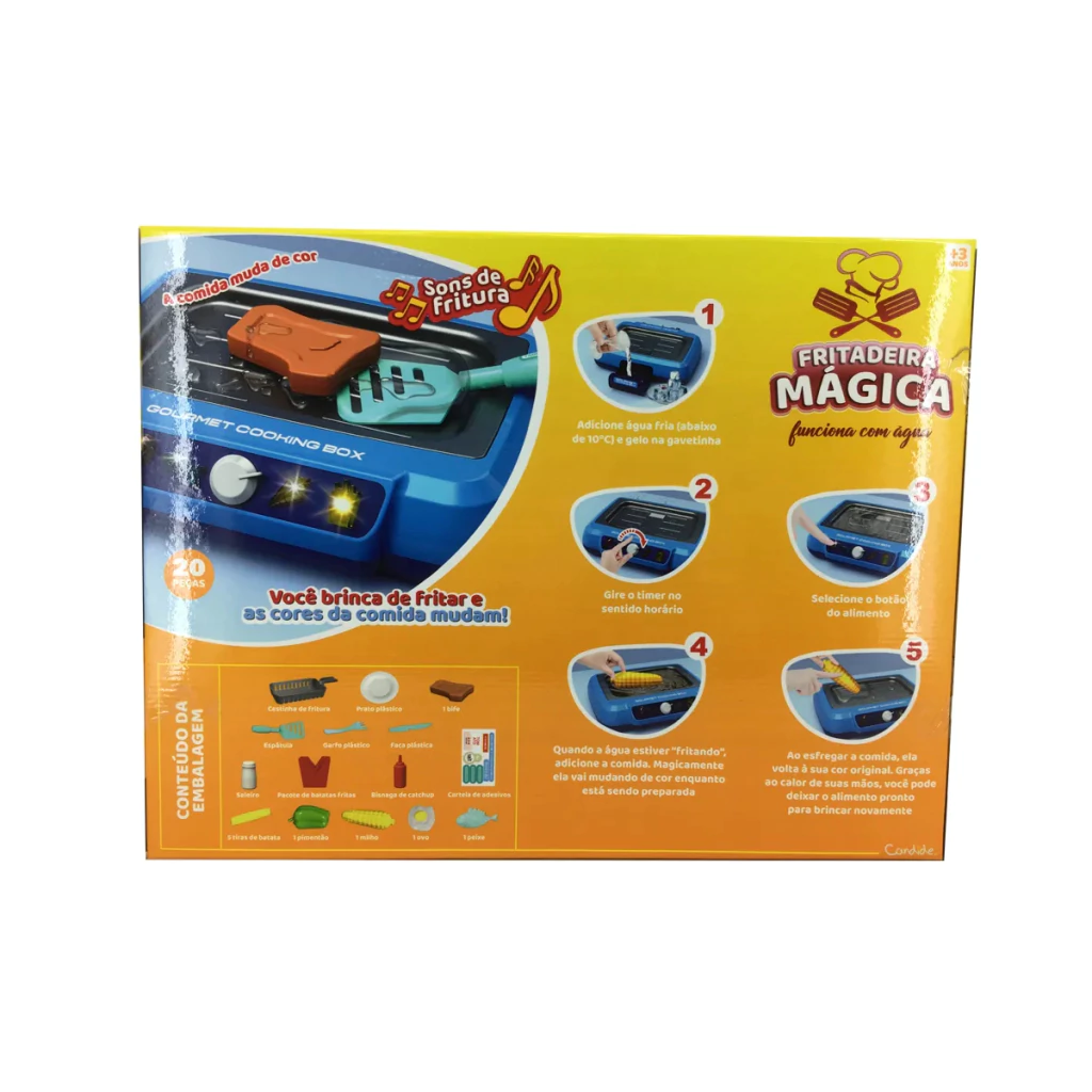 A Fritadeira Friggi Friggi Mágica Candide 7960 é uma divertida fritadeira de brinquedo que simula uma verdadeira experiência de fritura com luzes, sons e alimentos que mudam de cor ao entrarem em contato com água gelada. Ideal para estimular o faz de conta e a criatividade das crianças, acompanha diversos acessórios e funciona com pilhas, proporcionando uma brincadeira segura e cheia de imaginação.