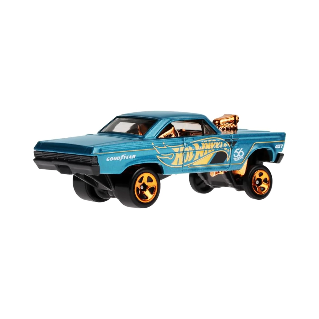 O Hot Wheels '65 Mercury Comet Cyclone, identificado pelos códigos HVW98-ND5104B|HDH54, é uma miniatura em escala 1:64 que homenageia o clássico muscle car americano. Parte da série comemorativa de 56 anos da Hot Wheels, este modelo apresenta um design detalhado com pintura metálica verde-azulada e detalhes dourados, sendo uma peça essencial para colecionadores e entusiastas de veículos clássicos.