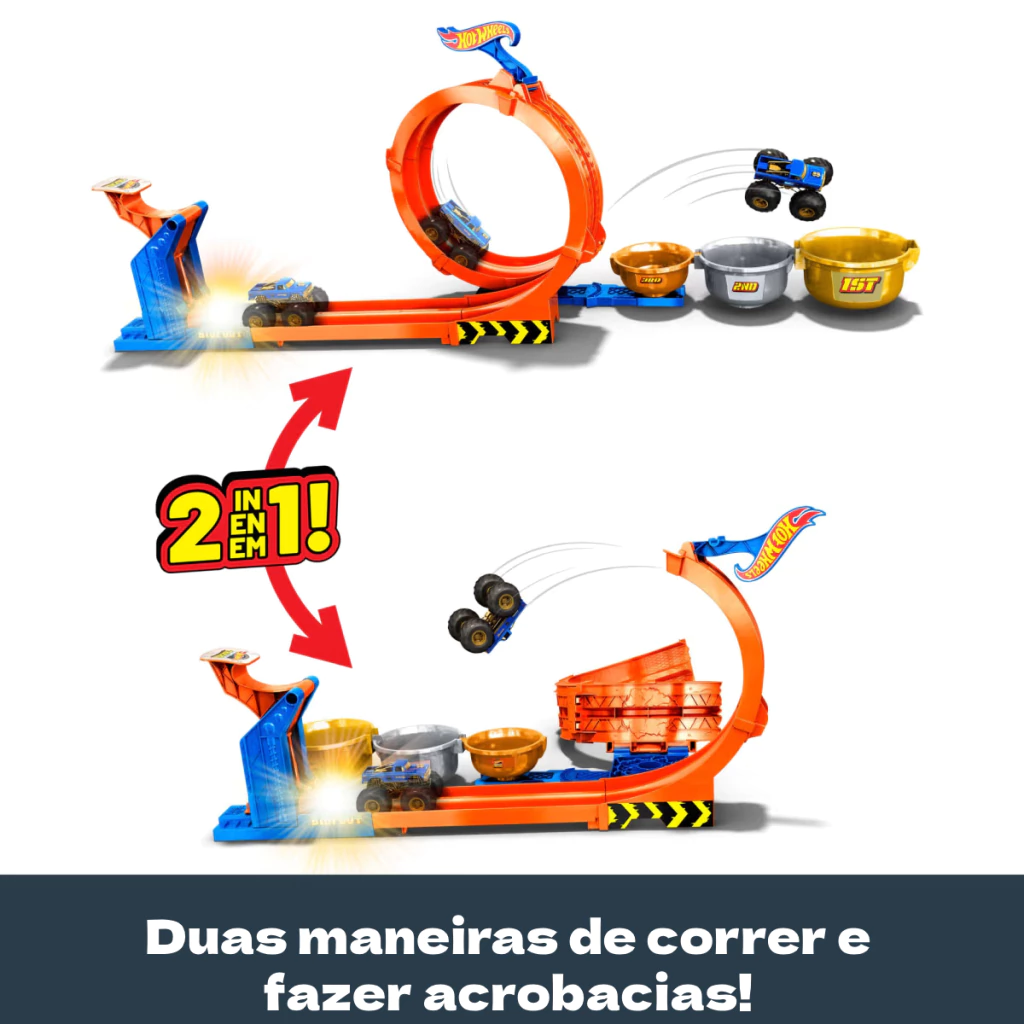 A Hot Wheels Monster Trucks Pista Troféu Big Foot Giros Extremos Mattel JBX64 é uma pista radical que leva a ação Monster Trucks a um novo nível de emoção. Com um looping vertical em forma de troféu e lançador de alta potência, os pequenos podem desafiar a gravidade e executar giros insanos com seus caminhões. Ideal para fãs de adrenalina e acrobacias, promove a coordenação motora e o pensamento estratégico ao tentar completar o looping e derrubar os alvos no final da pista.