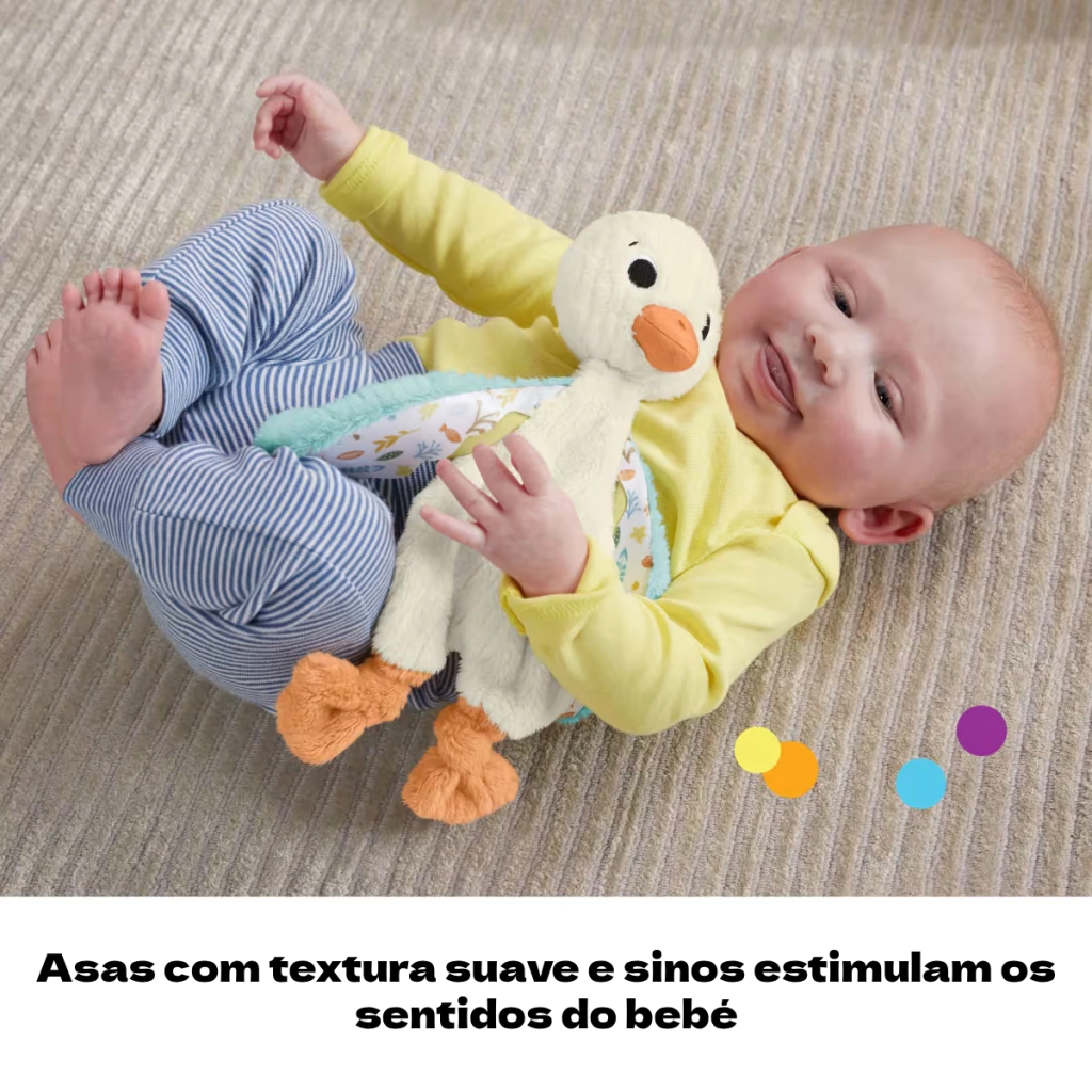A Naninha Ganso Amoroso Fisher‑Price Mattel HYD10 é uma pelúcia sensorial especialmente desenvolvida para bebês desde os 3 meses, com asas em tecido texturizado para estimular o tato, guizo suave que toca ao sacudir e formato compacto ideal para abraçar e levar em qualquer lugar.